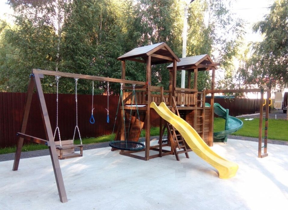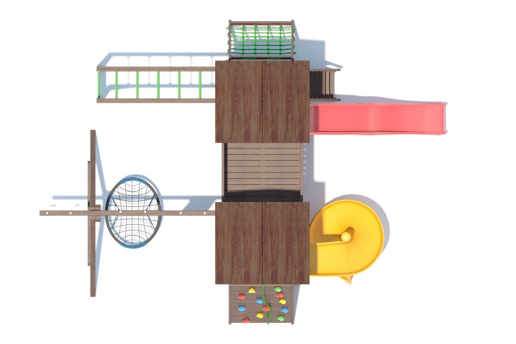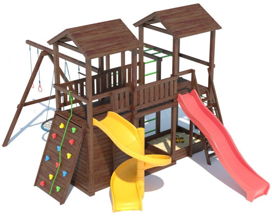 Основа детской игровой - спортивной конструкции – две башни с мостиком и игровой платформой. Конструкция оснащена двумя двускатными деревянными крышами, встроенным домиком, встроенной песочницей и дополнительной платформой в нижней части конструкции, пластиковыми волнообразным скатом и винтовым скатом с превосходной скользящей поверхностью, деревянной лестницей, широким скалодромом, канатной лестницей, деревянным рукоходом, шведской стенкой, приставными качелями, сидением качели «гнездо», гимнастическими кольцами и подвесной лестницей. Для безопасности ребенка предусмотрены перила на лестнице, заборчики и ограждения над зонами препятствий (скалодром, канатная лестница, скат).